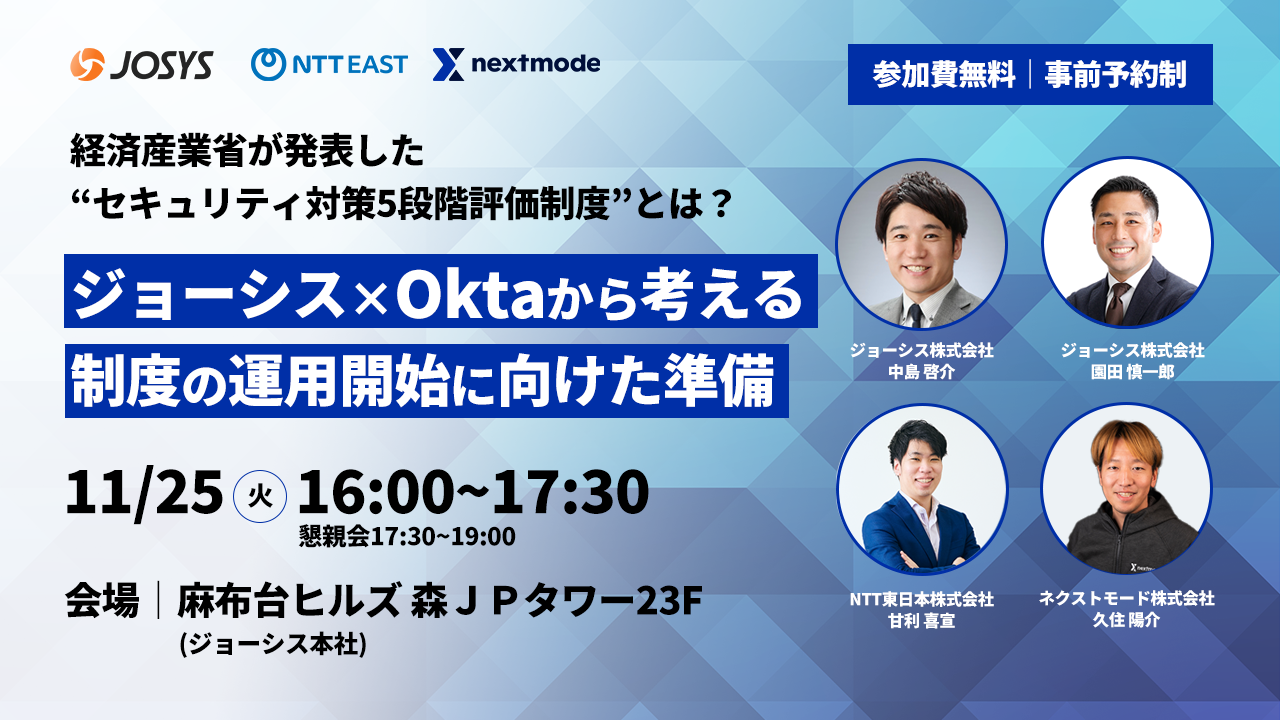 - 【11/25(火)16:00開催】経済産業省が発表した“セキュリティ対策5段階評価制度”とは?〜ジョーシス×Okta製品から考える 制度の運用開始に向けた準備〜に弊社の久住が登壇いたします